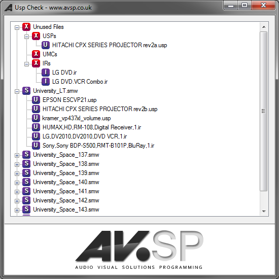 UspCheck parses Crestron SMW files to determine which umc, usp and ir files are used by each smw file.